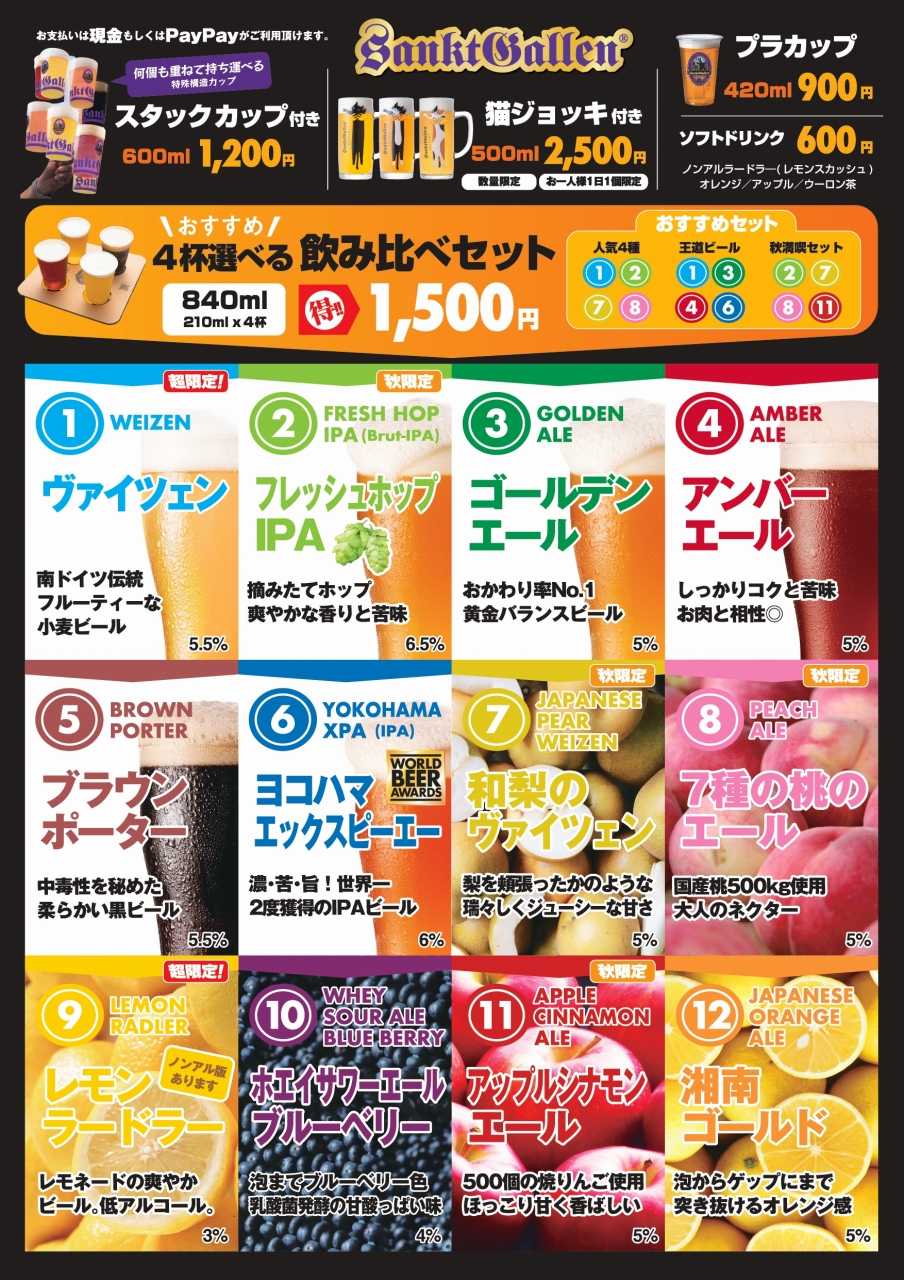 オクトーバーフェストには欠かせない小麦ビール「ヴァイツェン」の他、毎年オクトーバーフェストで人気の「7種の桃のエール」と「和梨のヴァイツェン」など12種類のビールをご用意をしております。